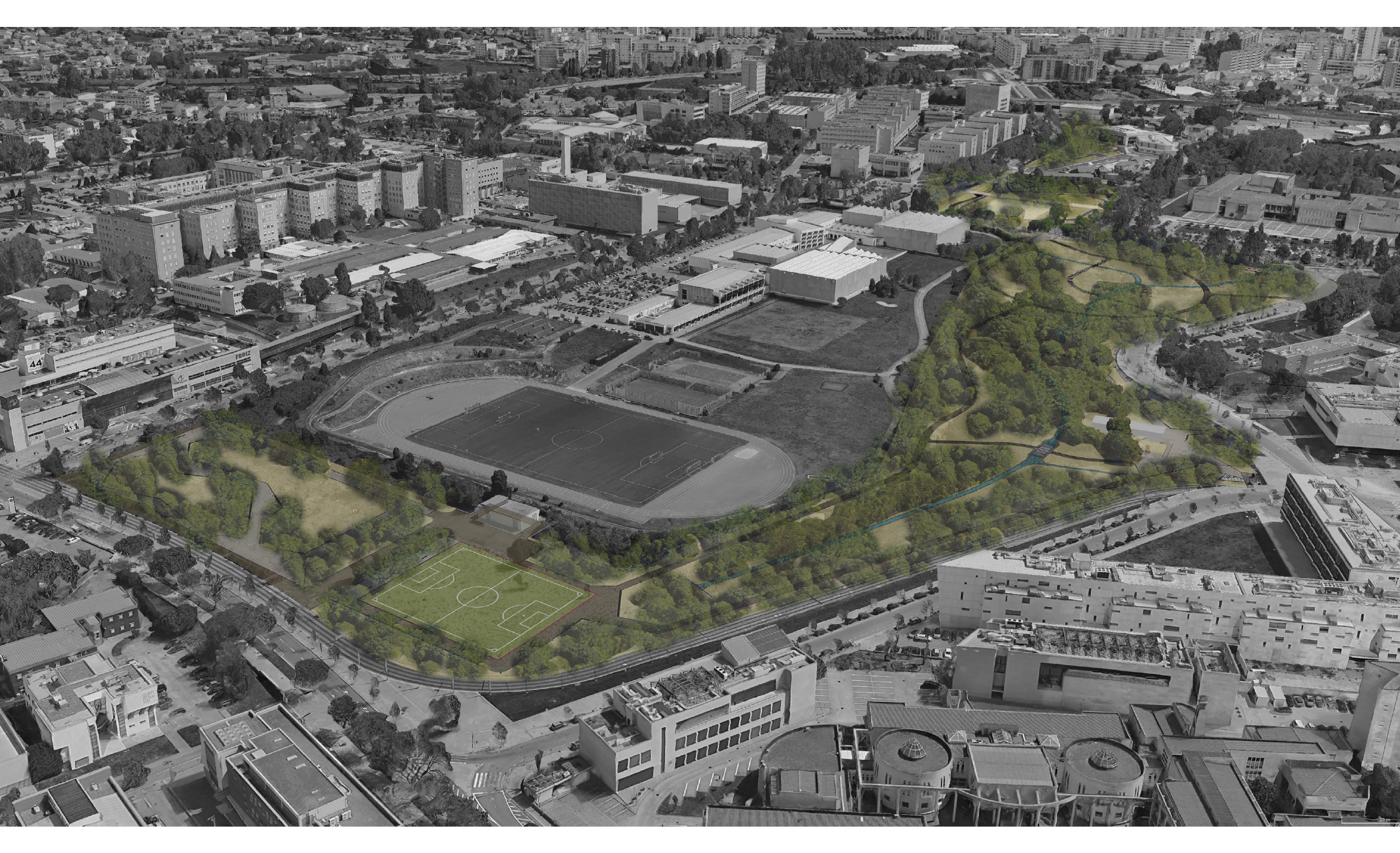 O Parque Central da Asprela é um espaço paisagístico único no Porto, projetado para ser o ponto de ligação de todo o campus universitário da Asprela e o novo “pulmão verde” da cidade, beneficiando milhares de estudantes e trabalhadores da Universidade do Porto. Ocupa uma área de cerca de 56.855 m², incluindo zonas húmidas associadas às ribeiras e zonas secas com clareiras e bosques, que são organizadas para criar uma rede de percursos pedonais e cicláveis acessíveis, com espaços de recreio, miradouros e áreas com elevada amenidade microclimática para mitigação de picos de calor.